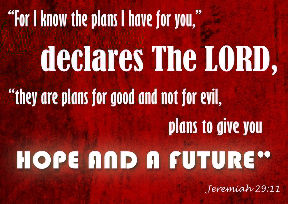 Jeremiah 29:11 "For I know the plans I have for you," declares the Lord, "they are plans for good and not for evil, plans to give you hope and a future."