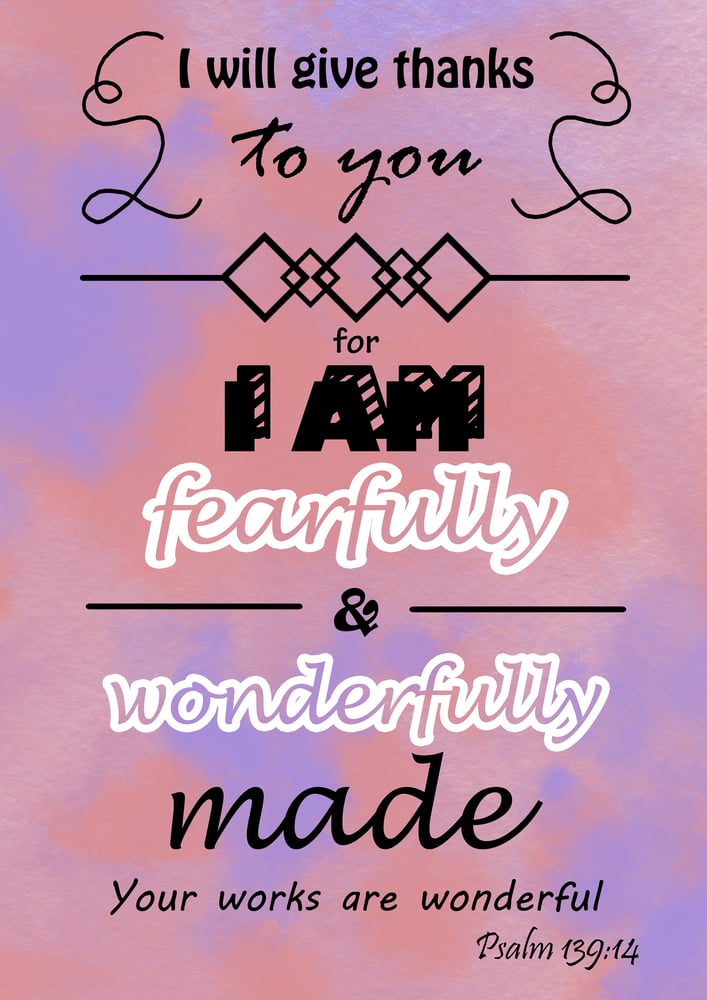 Psalm 139:14 I will give thanks to You for I am fearfully and wonderfully made. Your works are wonderful.